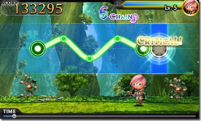 Anywho, you start by selecting 4 characters to add to your party. The heroes from all games are available. Extra characters are available to unlock through collecting crystal shards. By going through music scores playing epilepsy Guitar Hero by using your pen, you gain experience, level up, find treasures and get ridiculous cramps in your pinky.